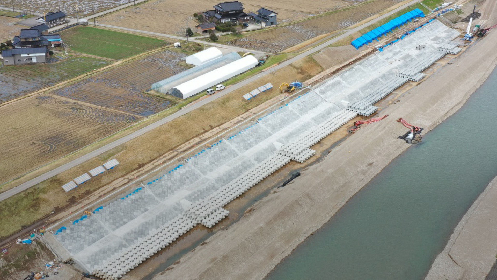 小矢部川・矢水町護岸災害復旧工事は、北陸地整の富山河川国道事務所から発注を受けた工事だ。小矢部川は蛇行した河川なので、湾曲区間外岸側で局所的に土砂が洗い流される「洗掘」が発生しやすいという特長がある。本工事は護岸ブロックを設置することで増水時にも耐えられるようにすることを目的としている。現場で発生した土砂は最大10台のダンプトラックで搬出する計画だ。