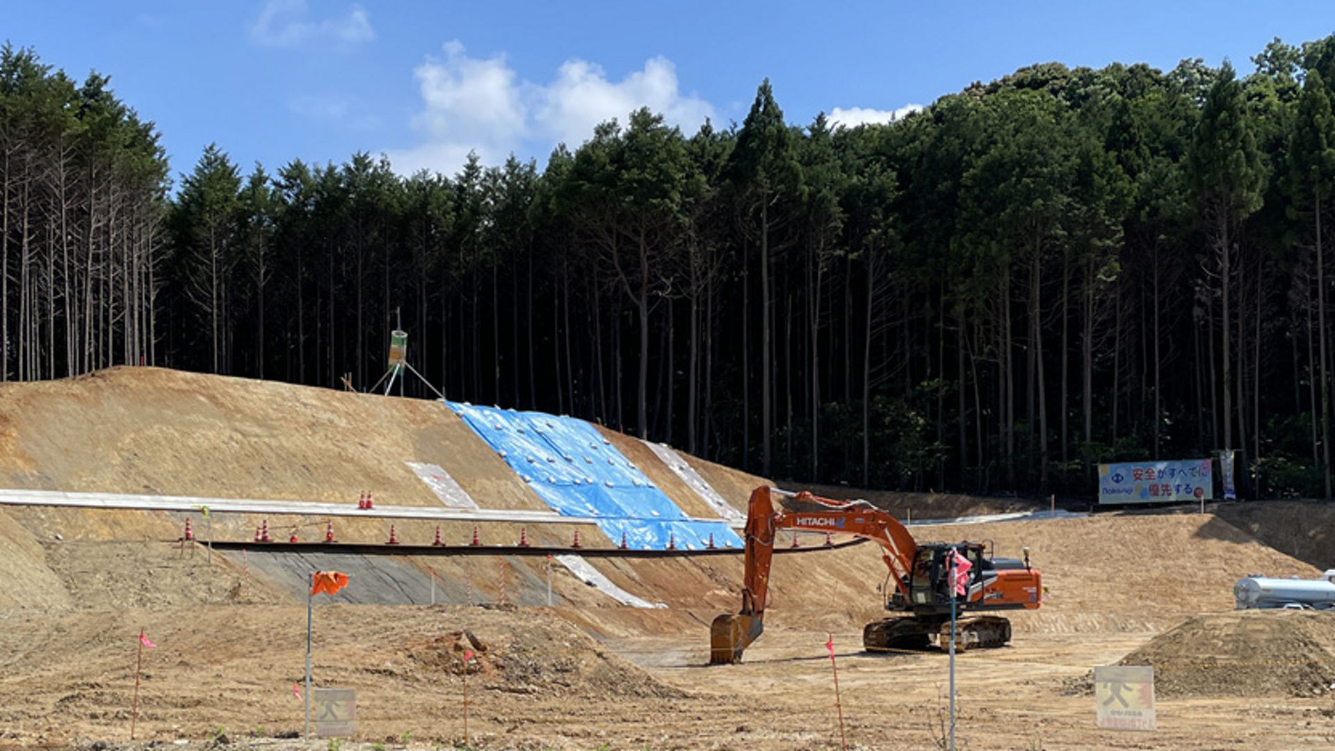 中筋組が施工する令和5年度静間仁摩道路大屋地区改良工事は、山陰自動車道の延伸により一時的に途切れた生活道路の機能回復が目的であり、約1年をかけて約2万4千m3の土砂を処理する。本現場ではICT施工が実施されており、丁寧に整形された法面は日立建機のICT建機、ZX200X-7で仕上げたものだ。一見、順調に施工している本現場には、「見えない課題」があった。