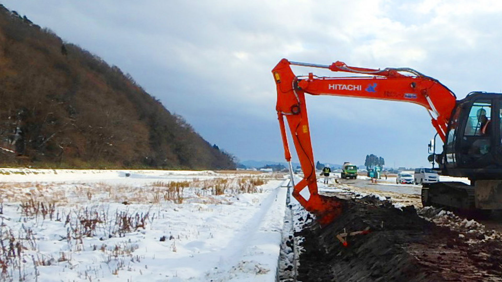 工事を受注後に発注者と協議し、ICTを活用し工事を進めることを決めた。本業は木工事、舗装工事、法面工事、水道工事、解体工事、除雪と地域のインフラを支えてきた(株)たかしん興業。初めてのi-Constructionの現場であり、今までICT建機を使用したことも無く、ICT活用についての知識がないなか日立建機日本よりICTの説明を聞いて、今まで導入した現場の事例や、導入後に困ったことがあってもすぐに対応してもらえると知りました。「日立建機日本とは長いお付き合いもありぜひお願いしたいと思った」(工務部部長:八重樫氏)